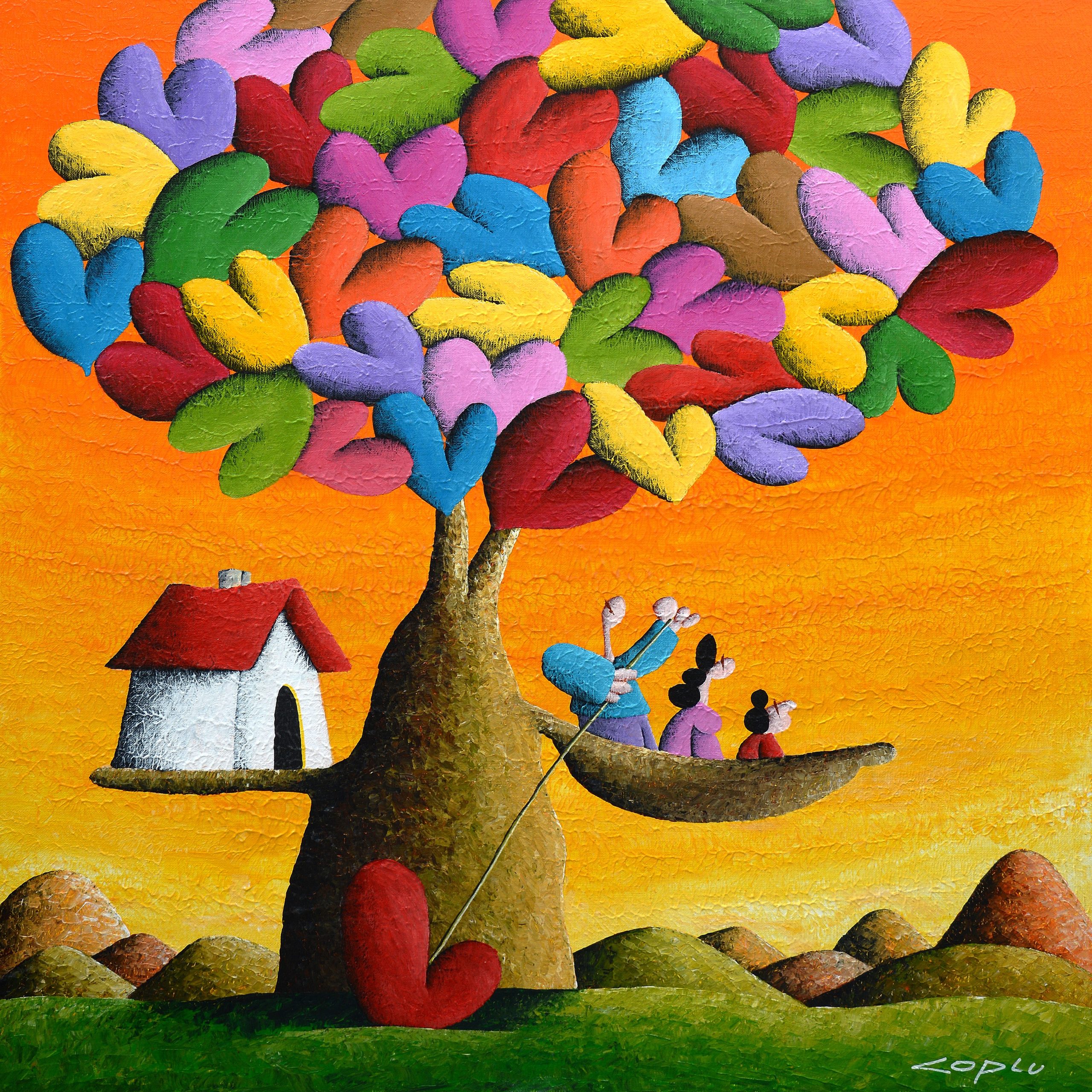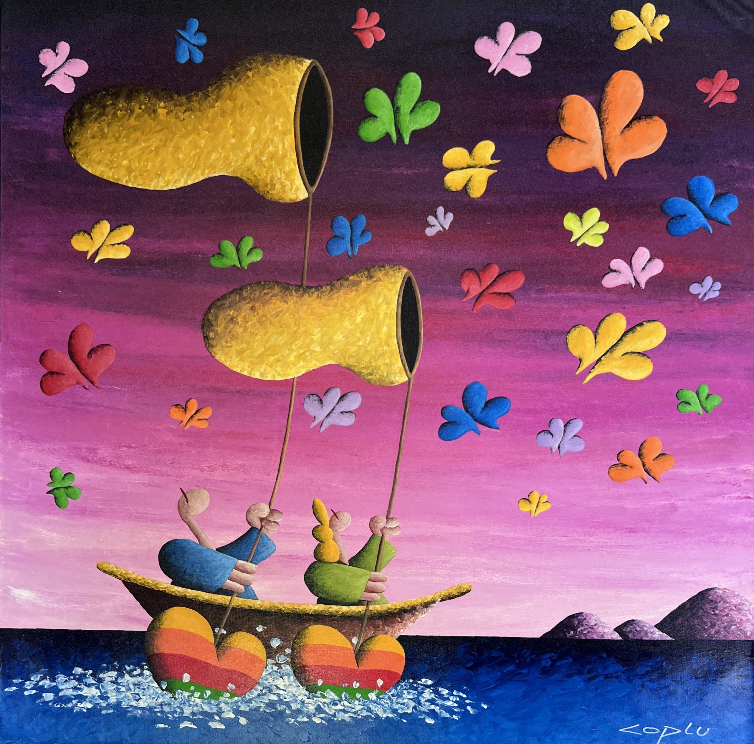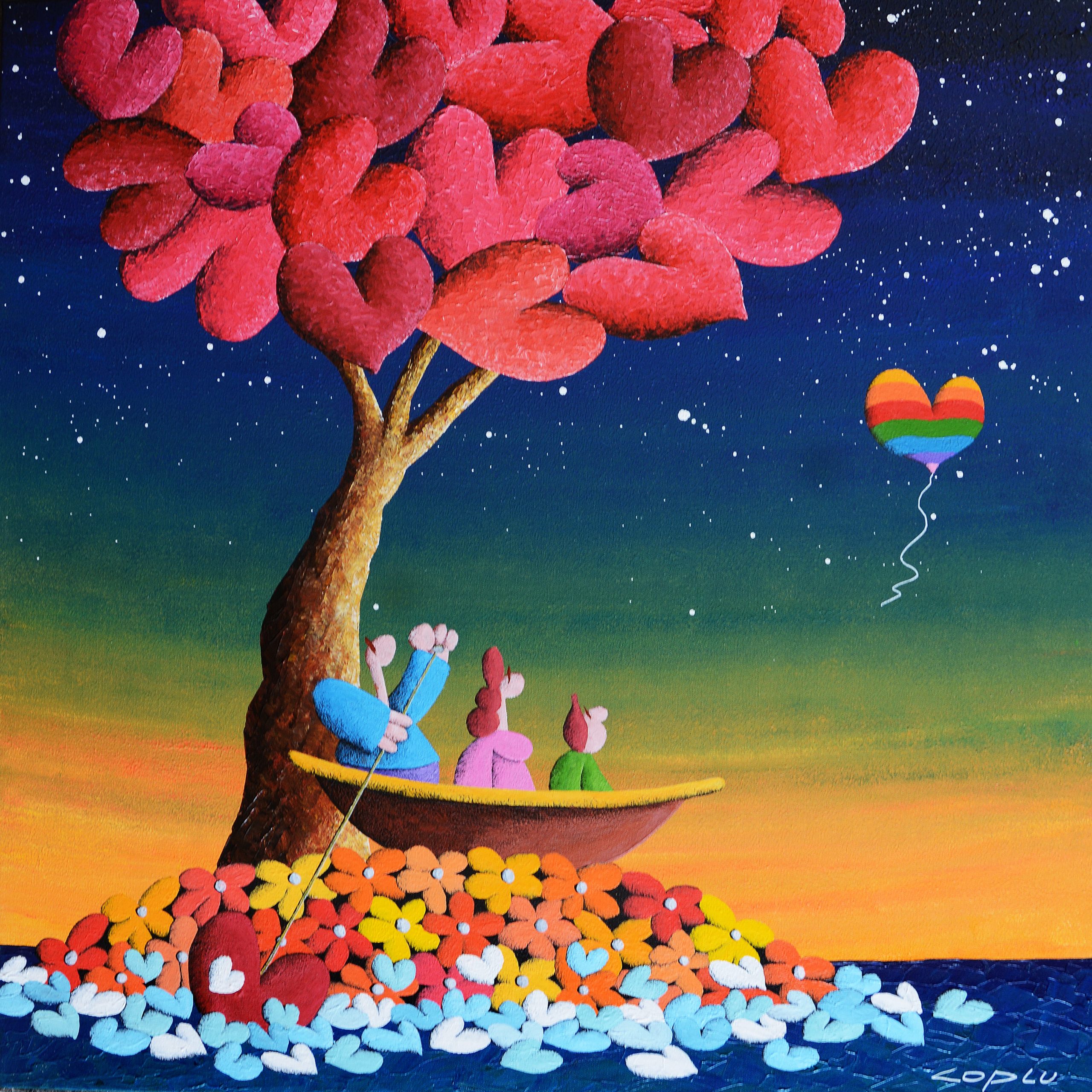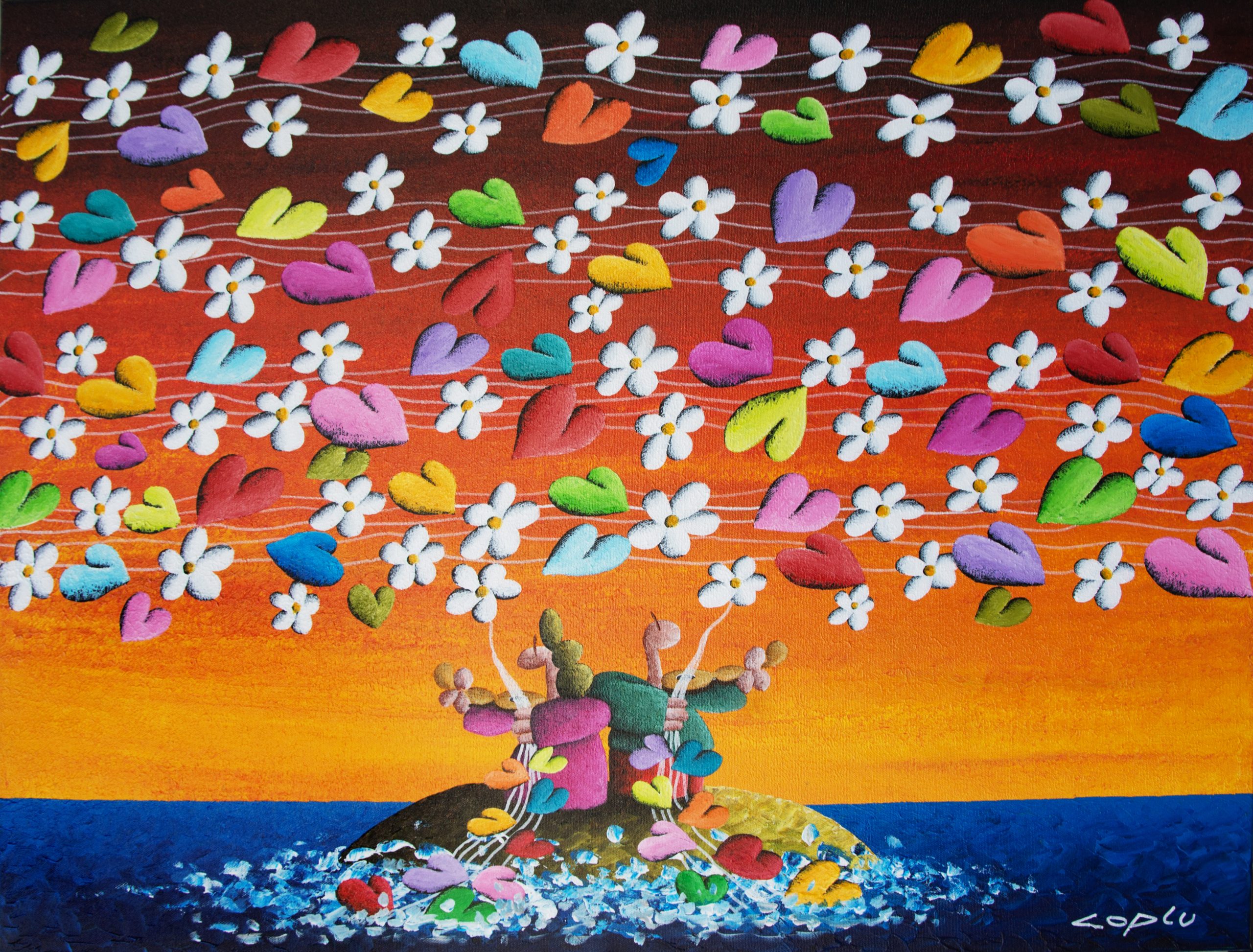 Coplu 擁有樂觀開朗的性格、充滿愛的靈魂於天馬行空的想像力,不難發現這些特質在他的創作中表露無遺。生動的色彩、幽默的題材與豐富的象徵是Coplu創作中缺一不可的元素。透過使用輕盈,強烈,鮮豔的色彩,托盤和筆刷的筆觸,描繪了我們與大自然互動的許多感受。在他的作品中,愛心代表人與人之間的情感、花朵象徵純潔與大自然的蓬勃生機、高飛的氣球承載著自由與夢想、樹木像徵者我們生命的開始和發展的家庭基礎、而船隻則有著展開旅程與表現冒險的精神。